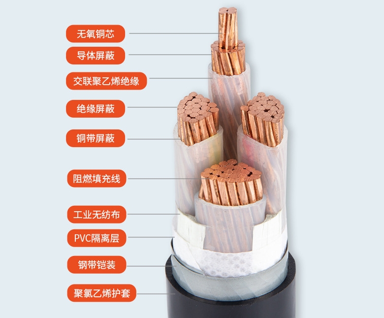 不論是何種品種的電力電纜,其最基本的組成有三部分,即導(dǎo)體、絕緣層和護(hù)層。關(guān)于中壓及以上電壓等級的電力電纜,導(dǎo)體在運(yùn)送電能時,具有高電位。為了改進(jìn)電場的散布情況,減小導(dǎo)體外表和絕緣層外外表處的電場畸變,避免尖端放電,電纜還要有表里屏蔽層。總的來說,電力電纜的基本結(jié)構(gòu)有必要有導(dǎo)體(也可稱線芯)、絕緣層、屏蔽層和護(hù)層四部分組成,這四部分在組成和結(jié)構(gòu)上的差異,就構(gòu)成了不同類型、不同用處的電力電纜,多芯電纜絕緣線芯之間,還需要添加填芯和填料,以利于將電纜絞制成圓形,便于出產(chǎn)制作和施工敷設(shè)。以下是這四個組成部分的效果和要求。